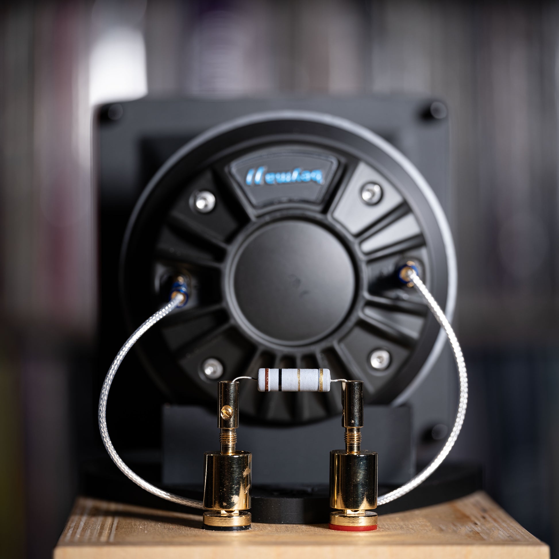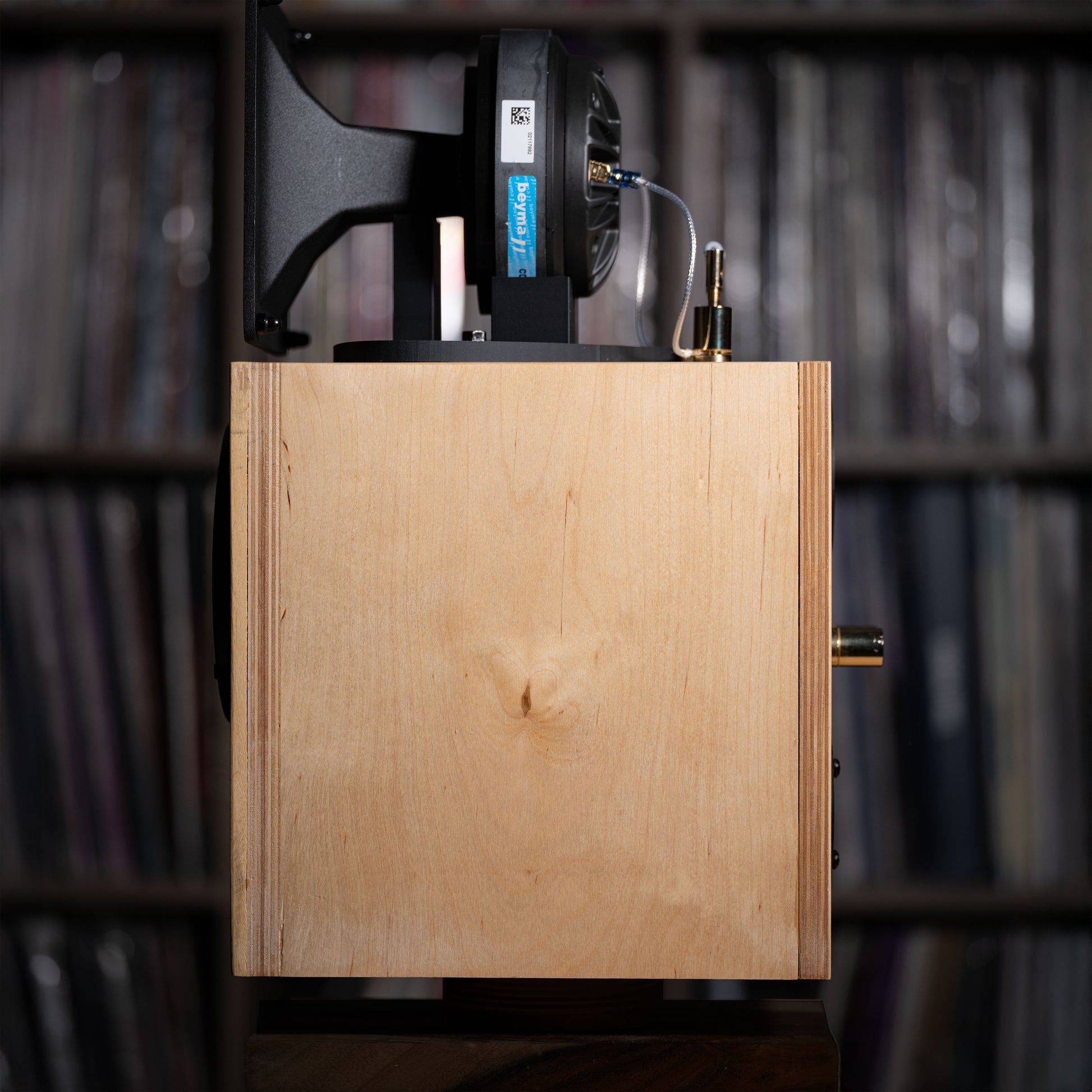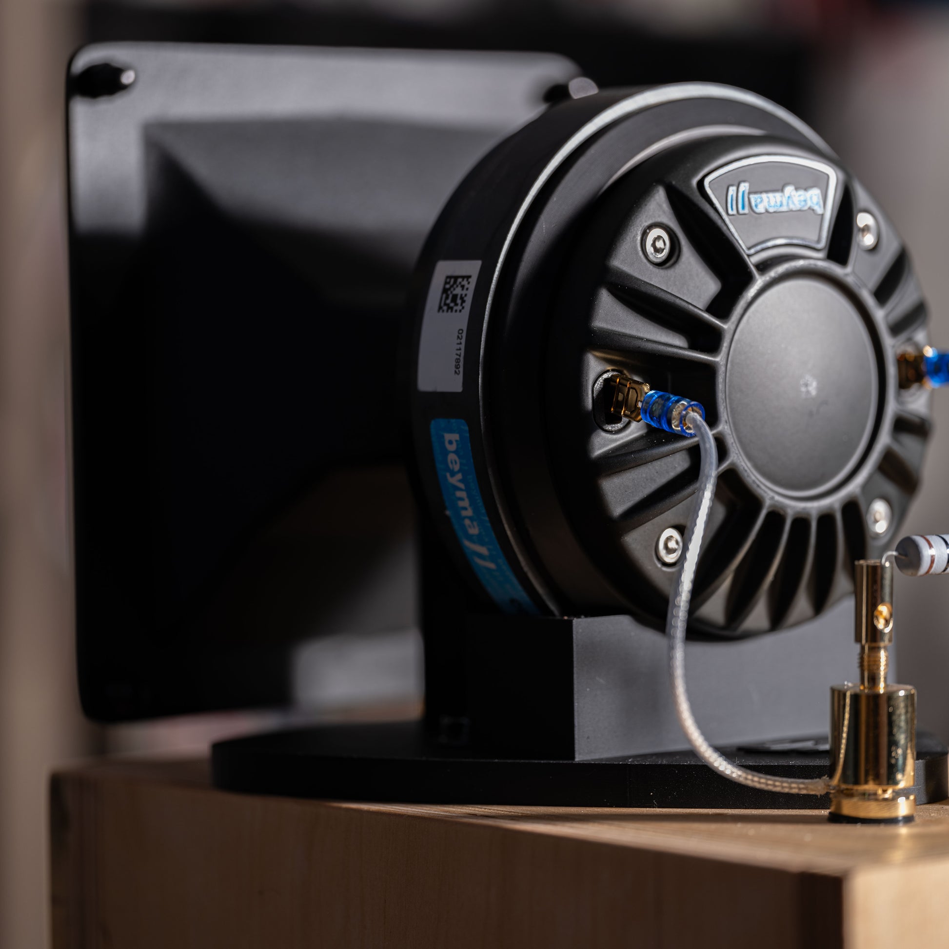 The updated cradle uses a reinforced 3D-printed mast and top plate, providing a stable and inert platform for the horn. No brackets, no screws into the cabinet, and no vibration transfer.